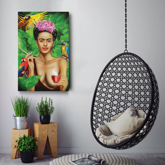 Frida Kahlo Coffee with Parrot Canvas Print | Iconic Artist Wall Art