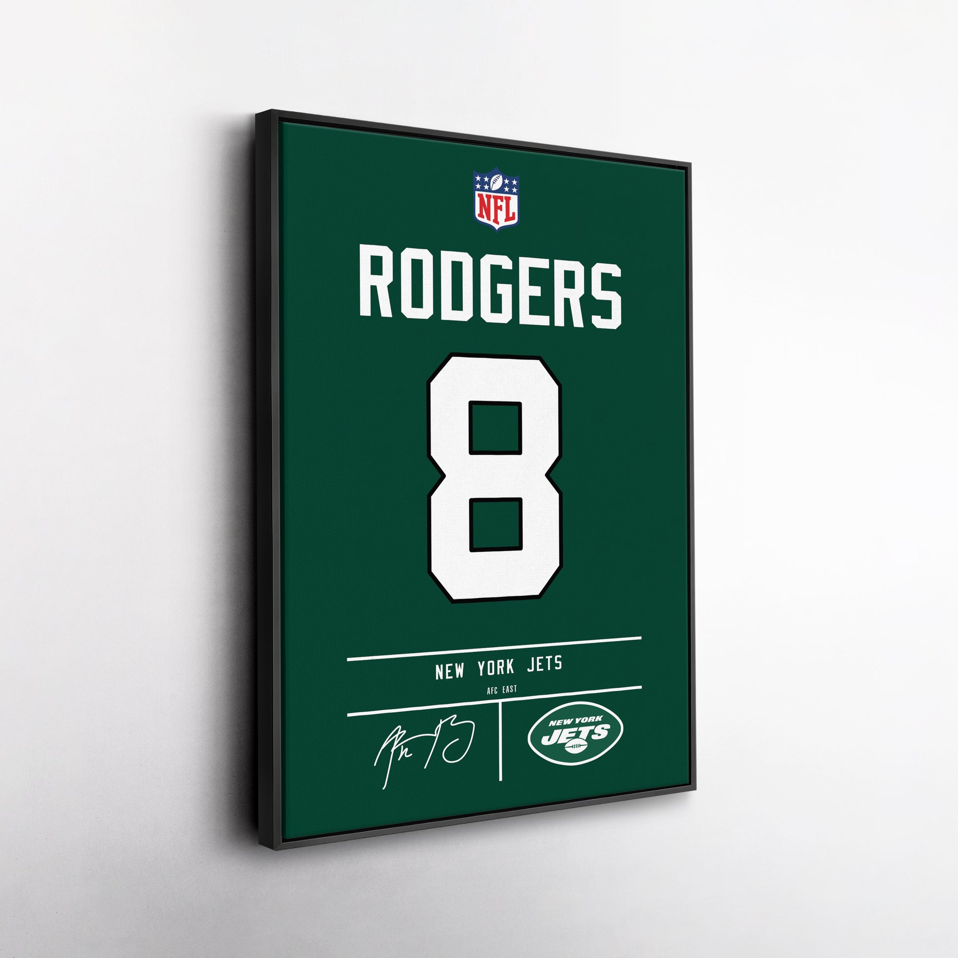 Featuring Aaron Rodgers’ iconic Jets jersey number and team logo, this premium canvas is available in various sizes and can be framed or unframed to suit your decor needs. It’s the ideal gift for sports enthusiasts and football lovers alike, offering high-quality materials and a lasting impression.