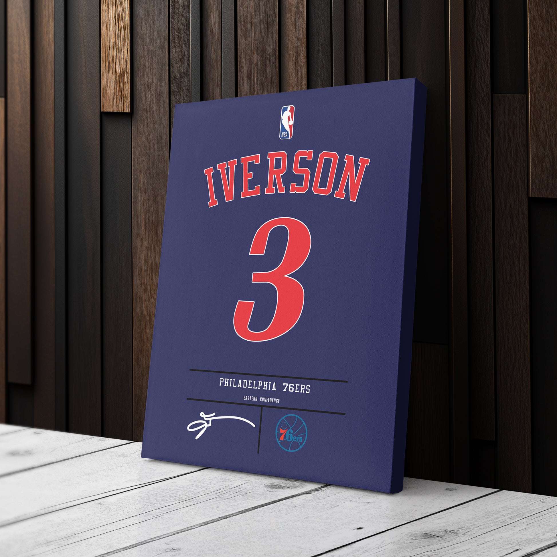 Elevate your space with this Allen Iverson Jersey Canvas Print, designed to bring the energy of Philadelphia 76ers basketball into your home. Perfect for die-hard 76ers fans, this vibrant wall art captures the essence of Allen Iverson's legendary career. Whether you’re enhancing your fan cave, office, or living room, this made-to-order canvas print adds a bold and stylish touch to any setting.