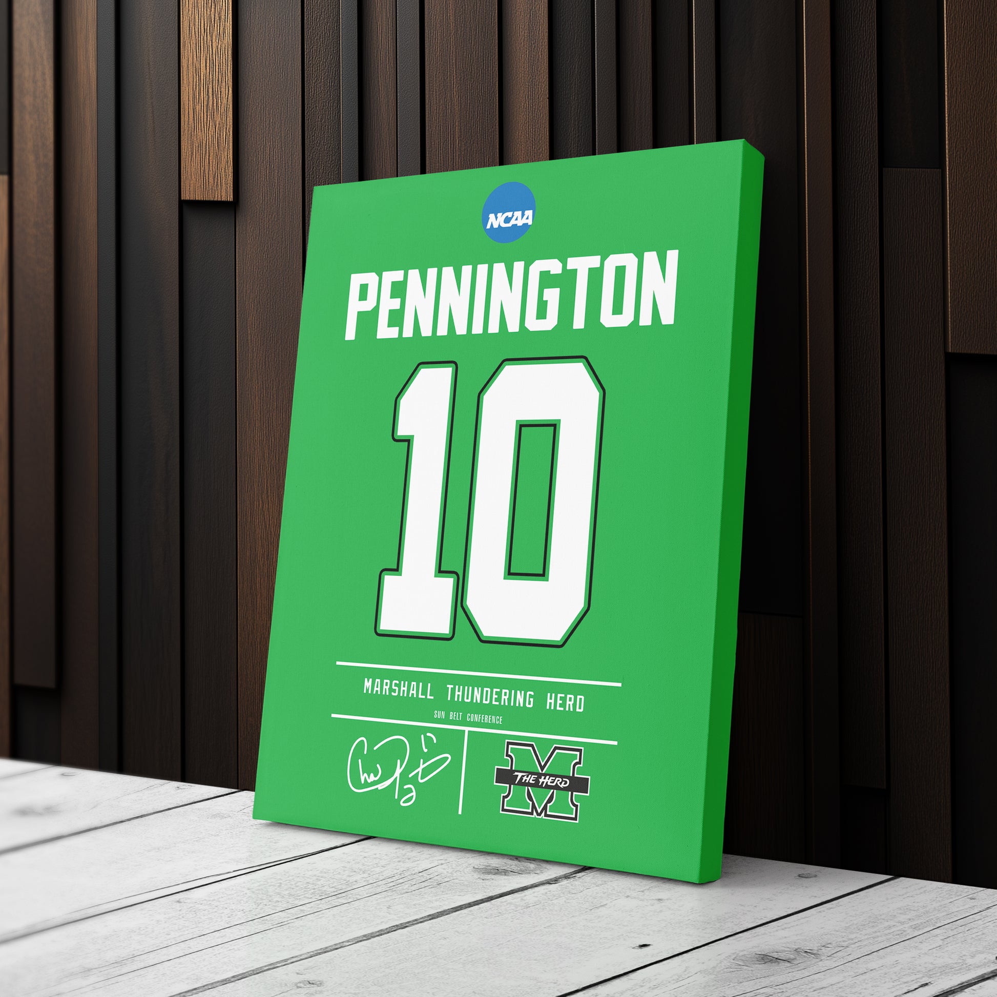 Featuring Chad Pennington’s iconic Marshall Thundering Herd jersey number and team logo, this premium canvas is available in various sizes and can be framed or unframed to suit your decor needs. It’s the ideal gift for sports enthusiasts and football lovers alike, offering high-quality materials and a lasting impression.