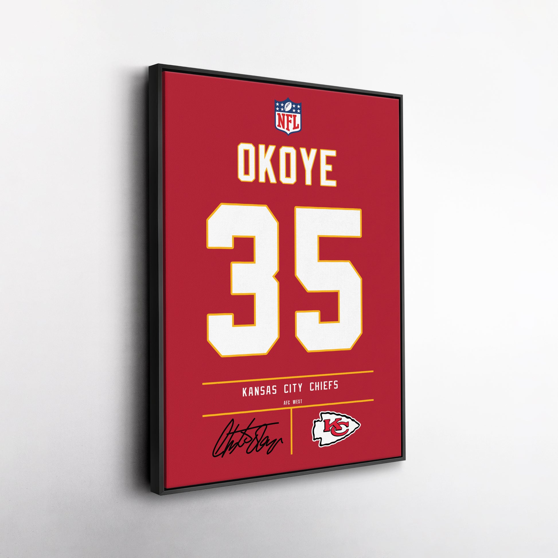 Featuring Christian Okoye’s iconic Chiefs jersey number and team logo, this premium canvas is available in various sizes and can be framed or unframed to suit your decor needs. It’s the ideal gift for sports enthusiasts and football lovers alike, offering high-quality materials and a lasting impression.