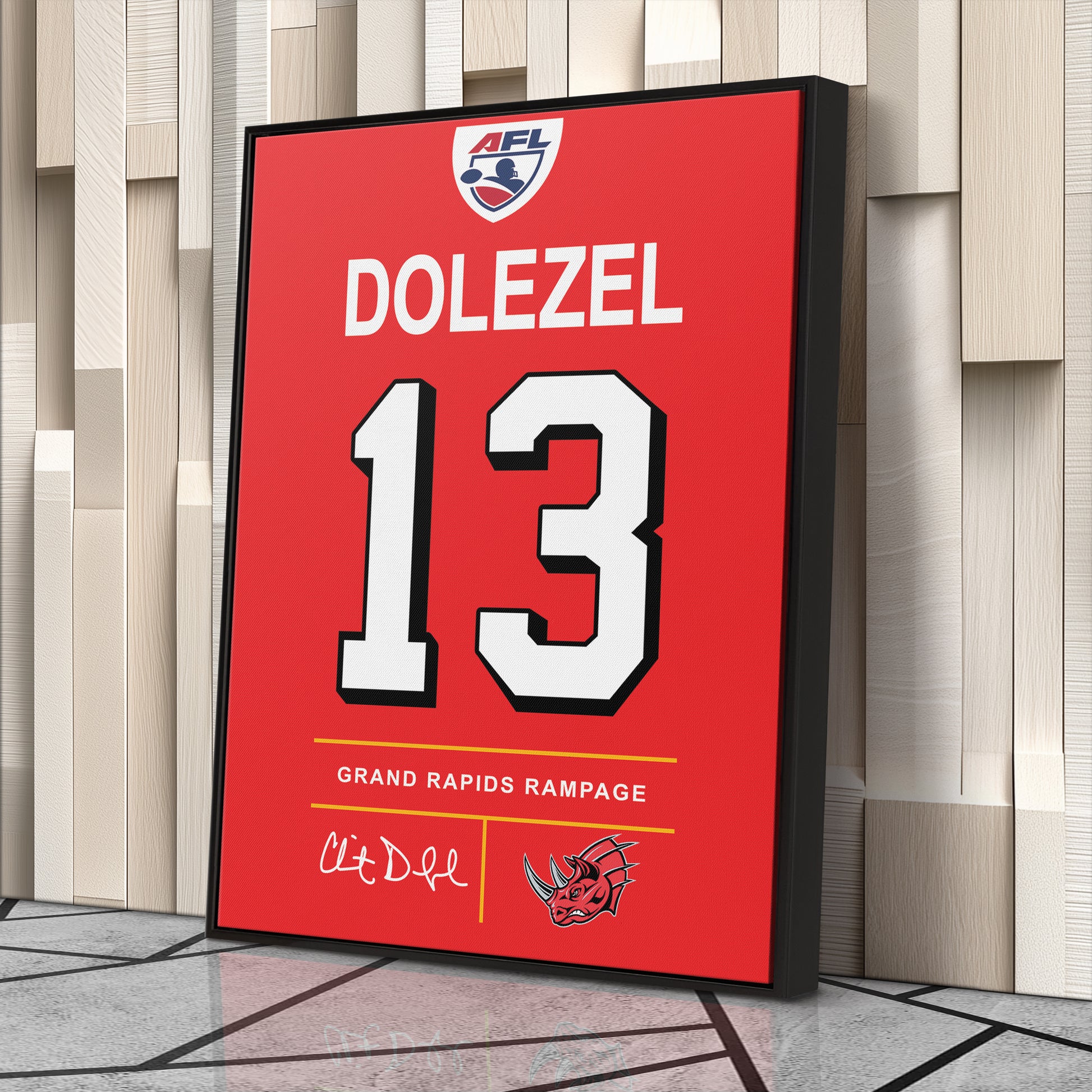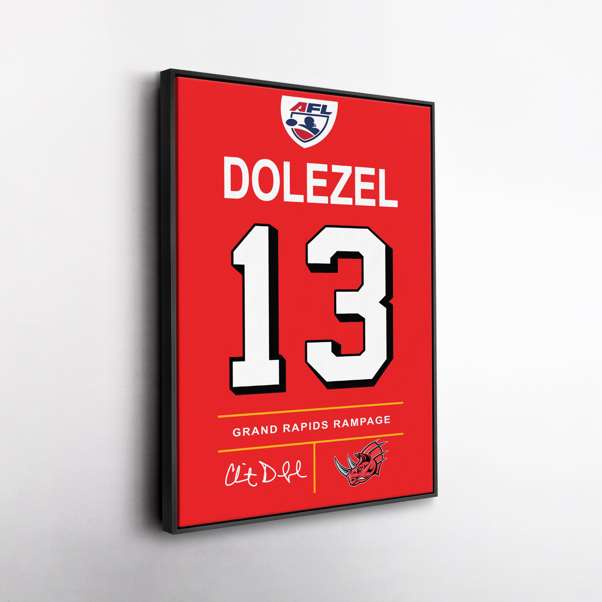 Featuring Clint Dolezel’s iconic Rampage jersey number and team logo, this premium canvas is available in various sizes and can be framed or unframed to suit your decor needs. It’s the ideal gift for sports enthusiasts and football lovers alike, offering high-quality materials and a lasting impression.