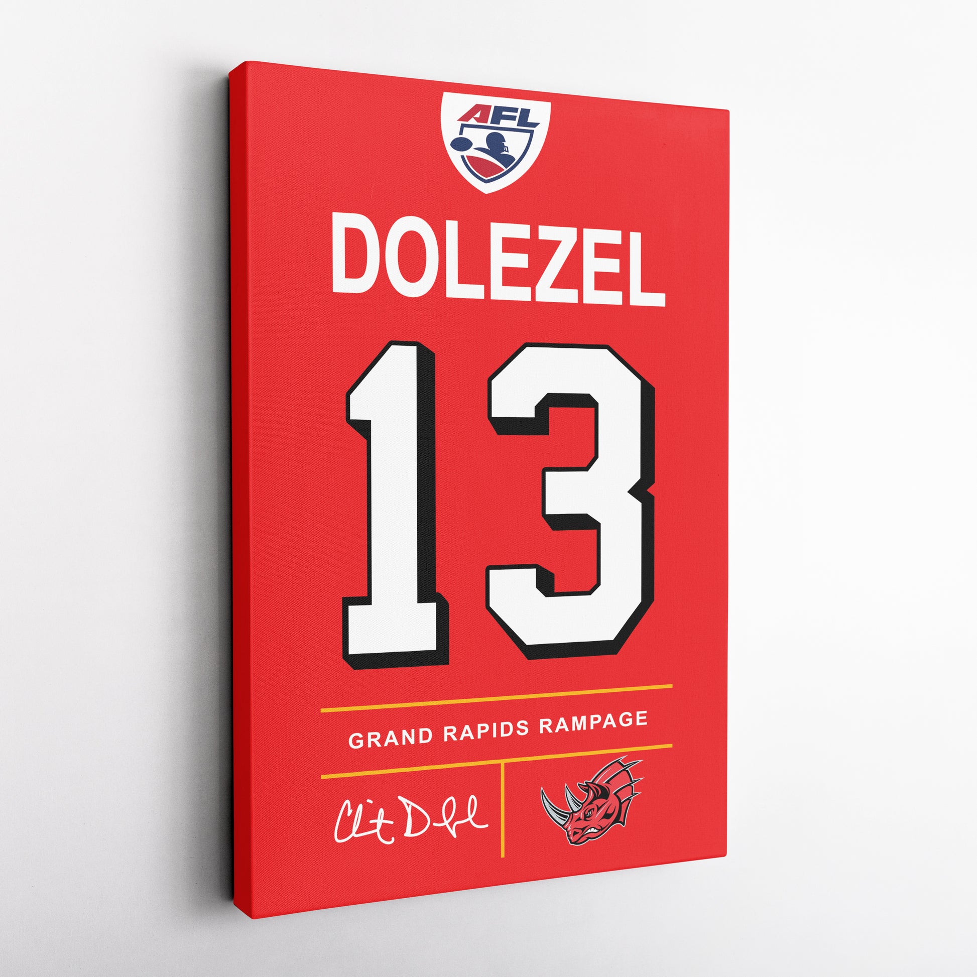 Elevate your space with this Clint Dolezel Jersey Canvas Print, designed to bring the energy of Grand Rapids Rampage arena football into your home. Perfect for die-hard Rampage fans, this vibrant wall art captures the essence of Clint Dolezel’s accomplished career in the Arena Football League. Whether you’re enhancing your fan cave, office, or living room, this made-to-order canvas print adds a bold and stylish touch to any setting.