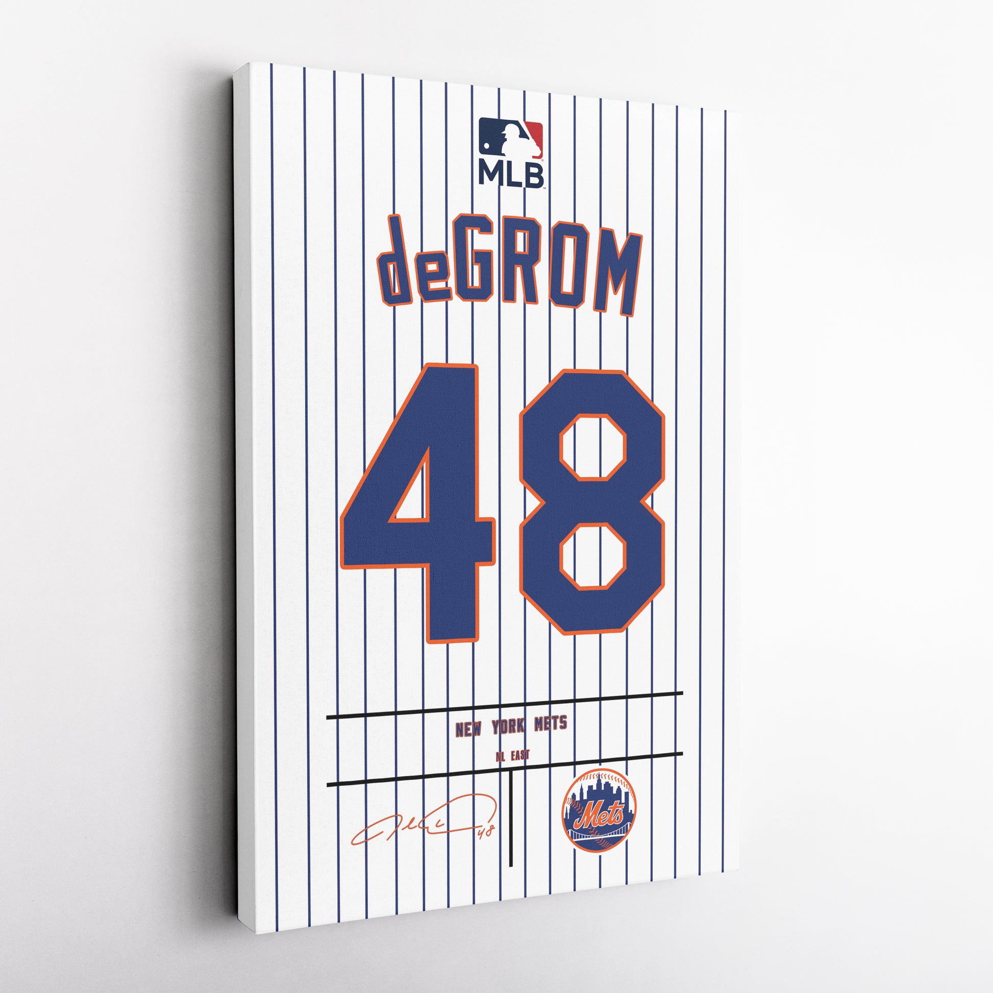 Elevate your space with this Jacob deGrom Jersey Canvas Print, designed to bring the energy of New York Mets baseball into your home. Perfect for die-hard Mets fans, this vibrant wall art captures the essence of Jacob deGrom's legendary career. Whether you’re enhancing your fan cave, office, or living room, this made-to-order canvas print adds a bold and stylish touch to any setting.