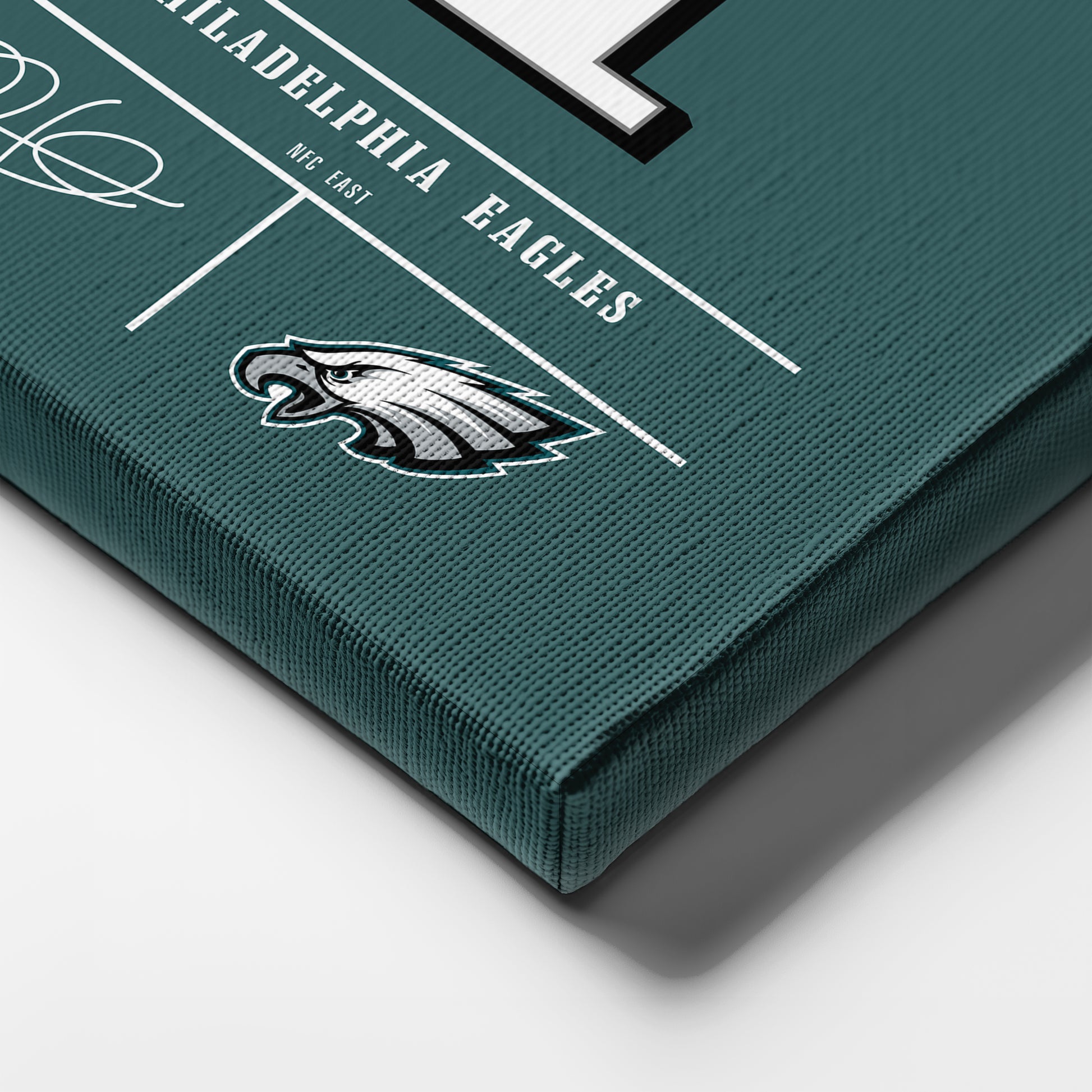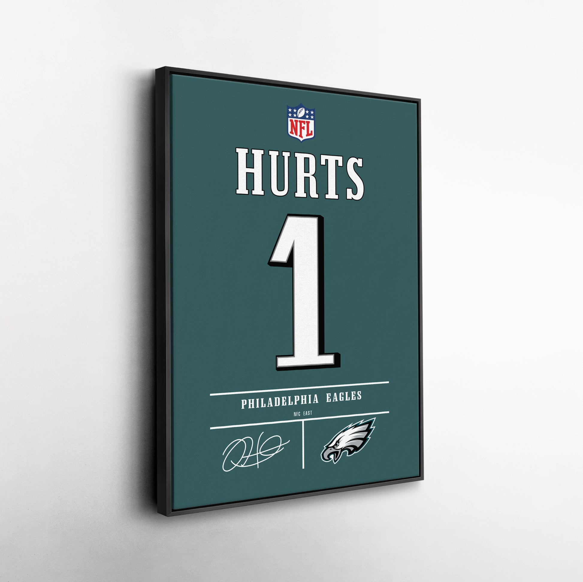 Featuring Jalen Hurts' iconic Eagles jersey number and team logo, this premium canvas print is available in various sizes and can be framed or unframed to match your décor. A perfect gift for football lovers, this high-quality canvas leaves a lasting impression, celebrating Hurts' impact on the field.