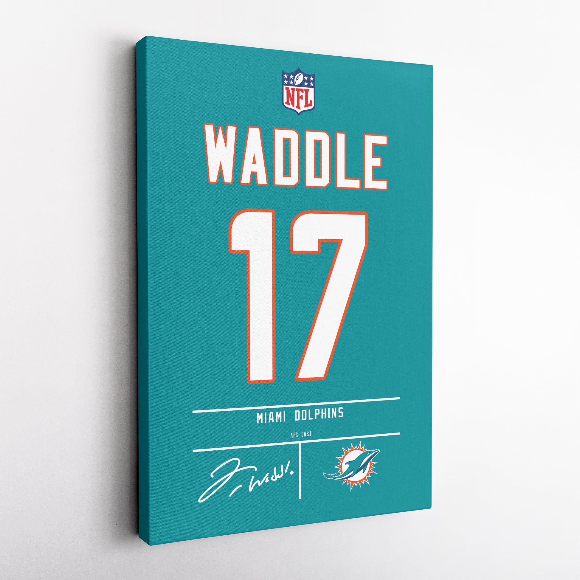 Featuring Jaylen Waddle’s iconic Miami Dolphins jersey number and team logo, this premium canvas is available in various sizes and can be framed or unframed to suit your decor needs. It’s the ideal gift for sports enthusiasts and football lovers alike, offering high-quality materials and a lasting impression.