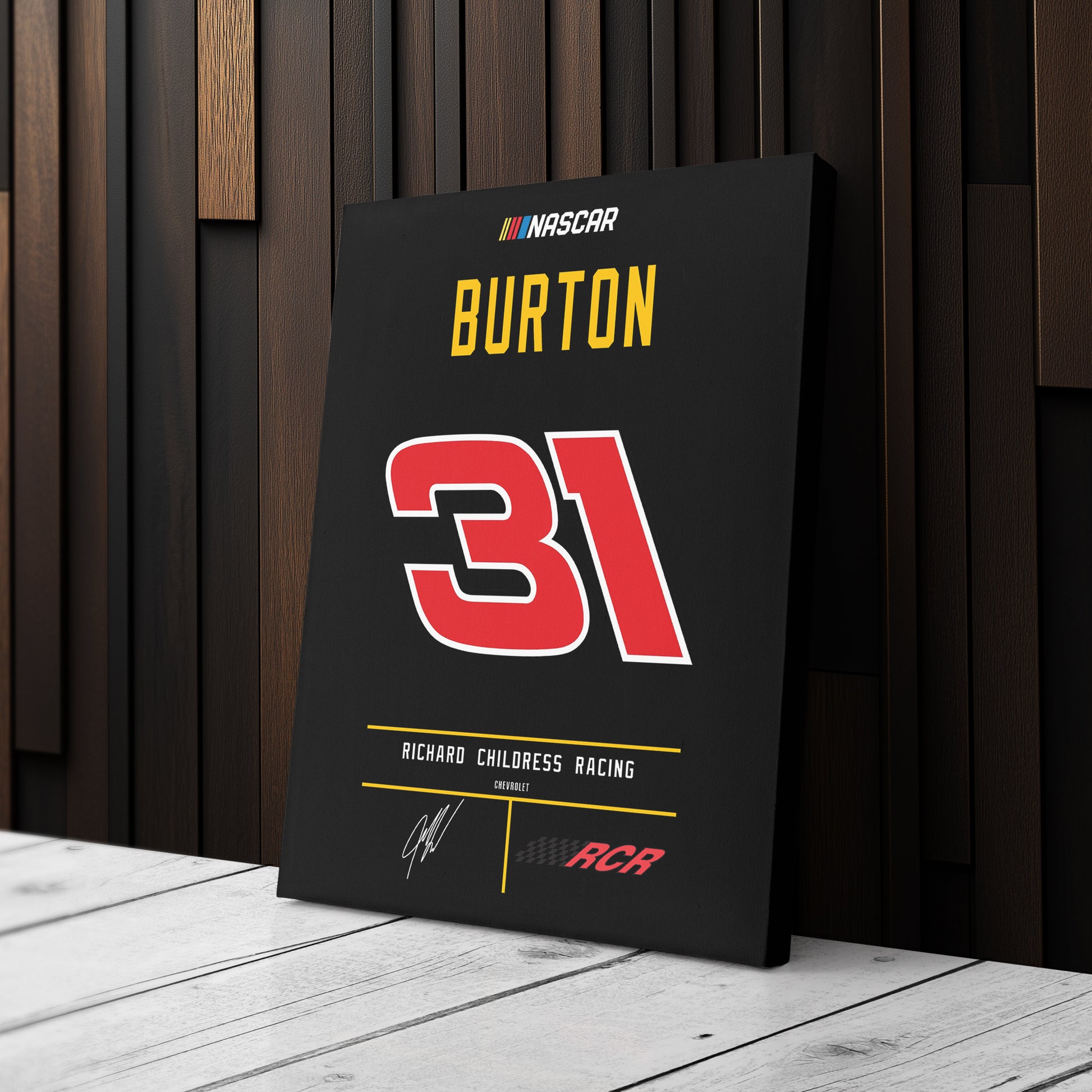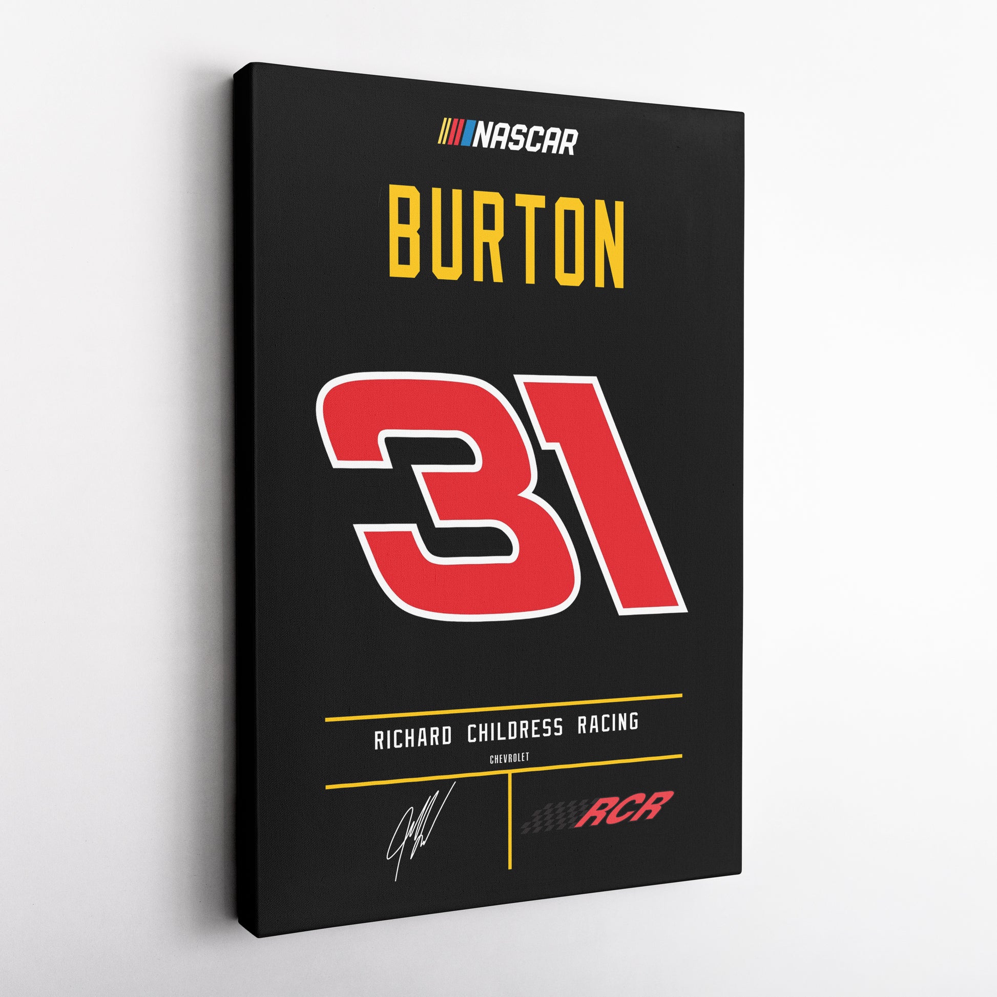 Featuring Jeff Burton’s iconic Richard Childress Racing jersey number and team logo, this premium canvas is available in various sizes and can be framed or unframed to suit your decor needs. It’s the ideal gift for motorsports enthusiasts and NASCAR lovers alike, offering high-quality materials and a lasting impression.