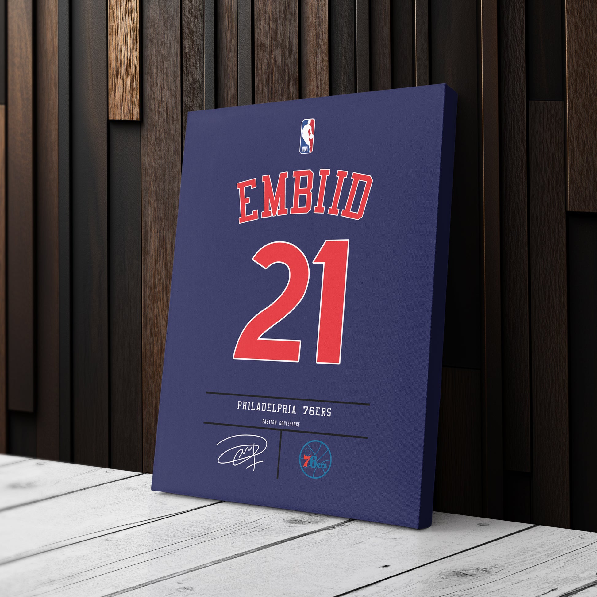 Elevate your space with this Joel Embiid Jersey Canvas Print, designed to bring the energy of Philadelphia 76ers basketball into your home. Perfect for die-hard 76ers fans, this vibrant wall art captures the essence of Joel Embiid's legendary career. Whether you’re enhancing your fan cave, office, or living room, this made-to-order canvas print adds a bold and stylish touch to any setting.