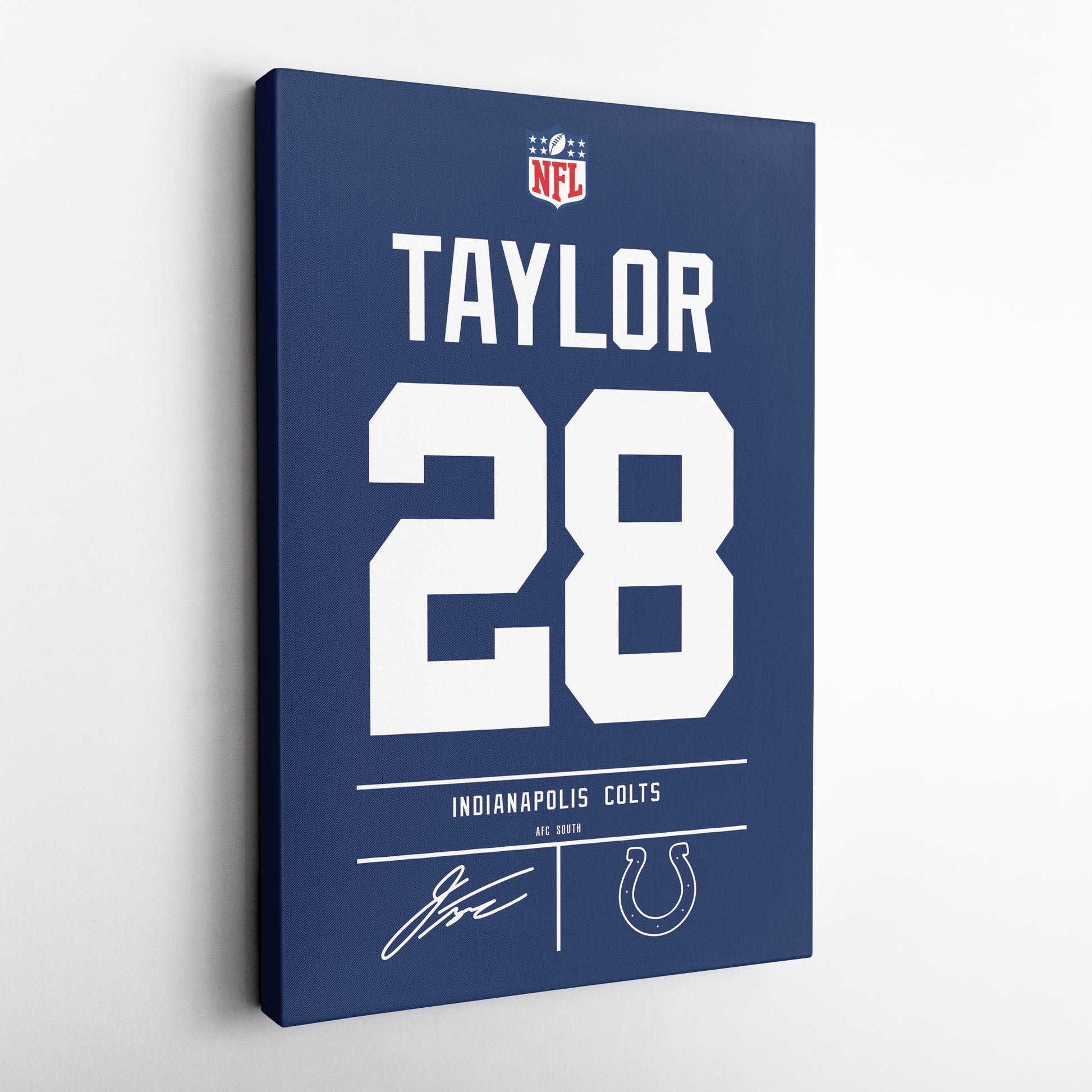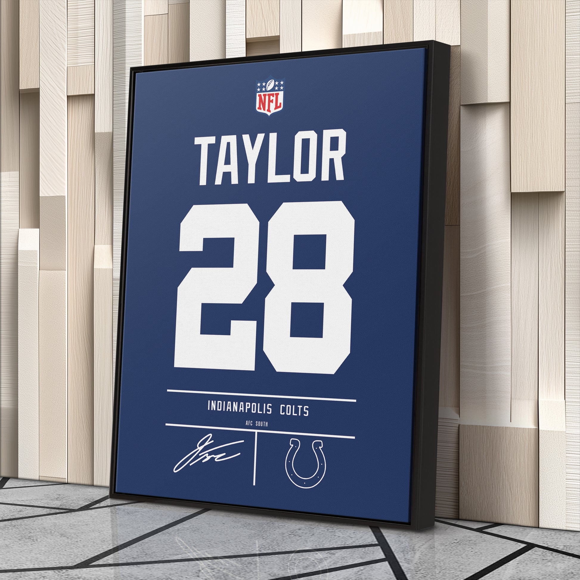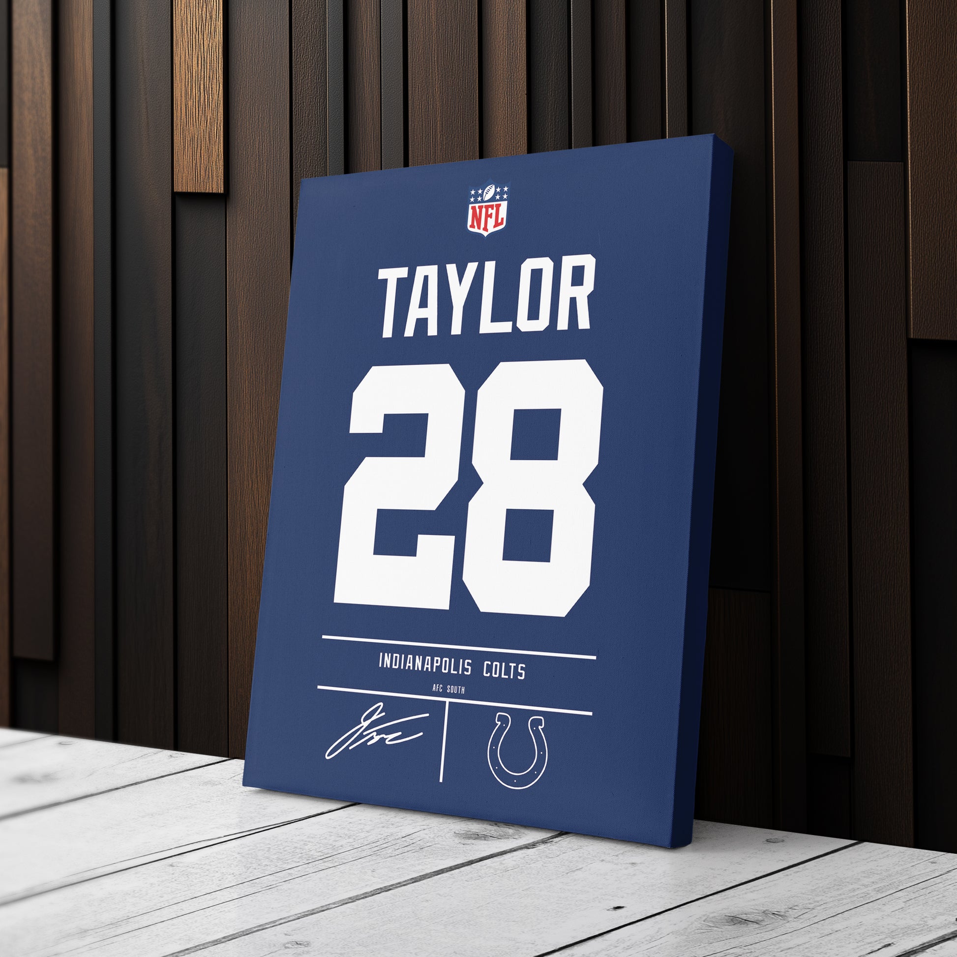 Featuring Jonathan Taylor’s iconic Indianapolis Colts jersey number and team logo, this premium canvas is available in various sizes and can be framed or unframed to suit your decor needs. It’s the ideal gift for sports enthusiasts and football lovers alike, offering high-quality materials and a lasting impression.