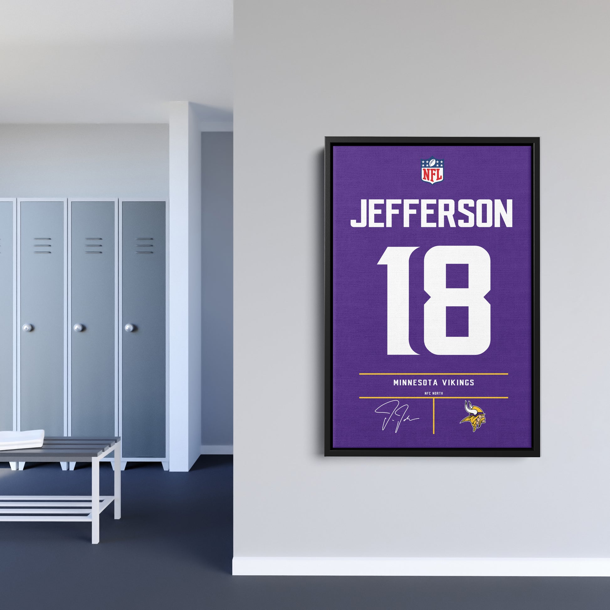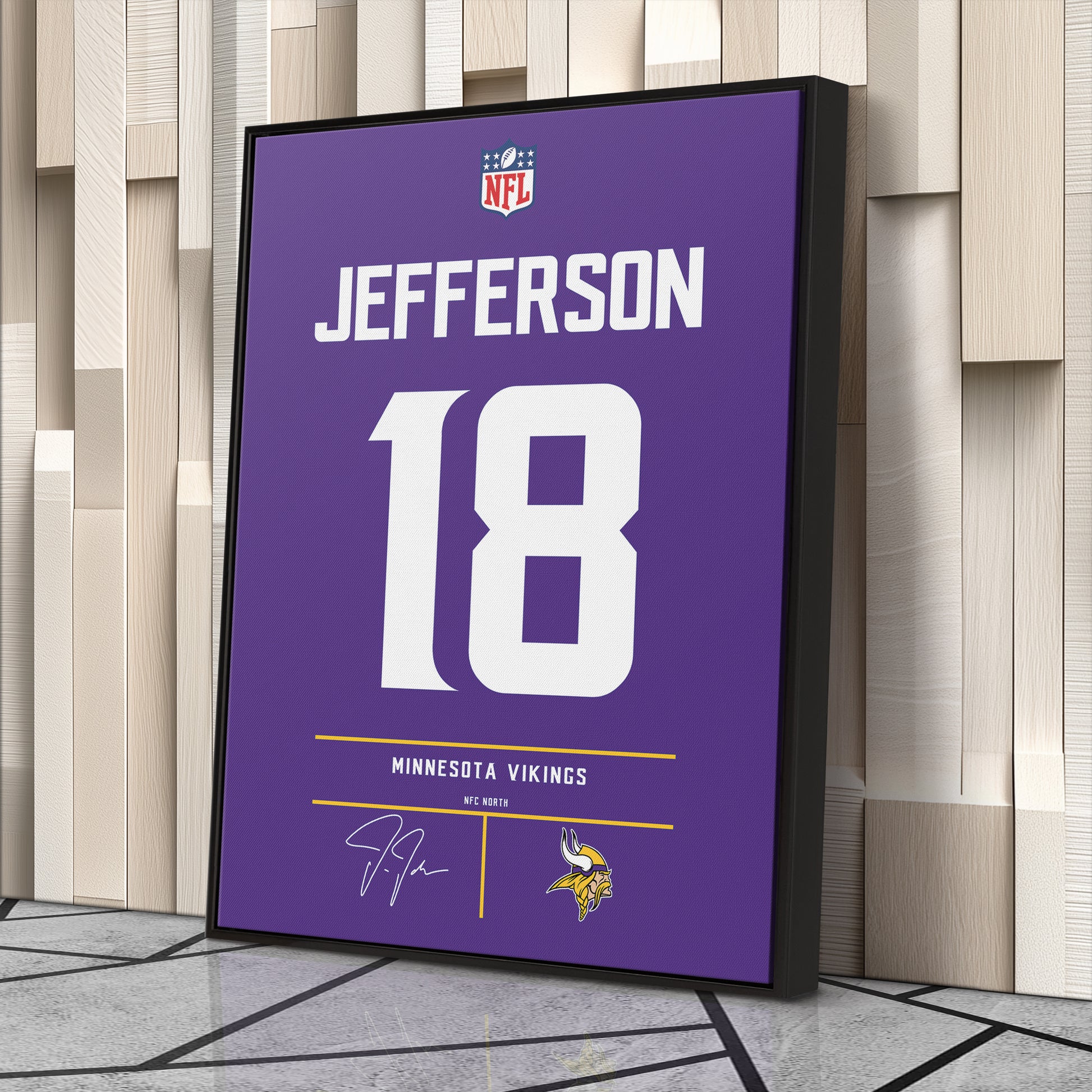 Featuring Justin Jefferson’s iconic Minnesota Vikings jersey number and team logo, this premium canvas is available in various sizes and can be framed or unframed to suit your decor needs. It’s the ideal gift for sports enthusiasts and football lovers alike, offering high-quality materials and a lasting impression.