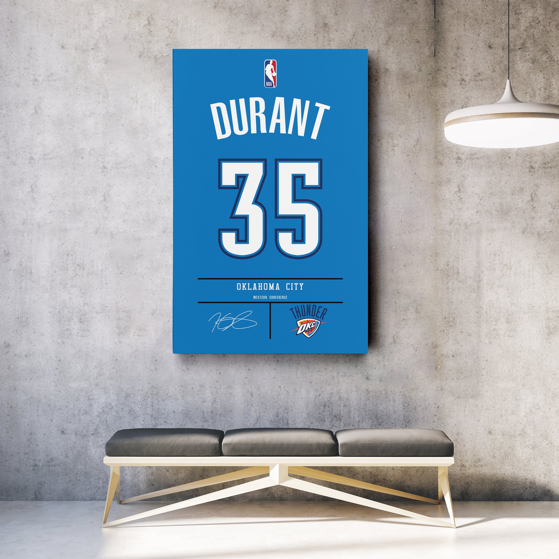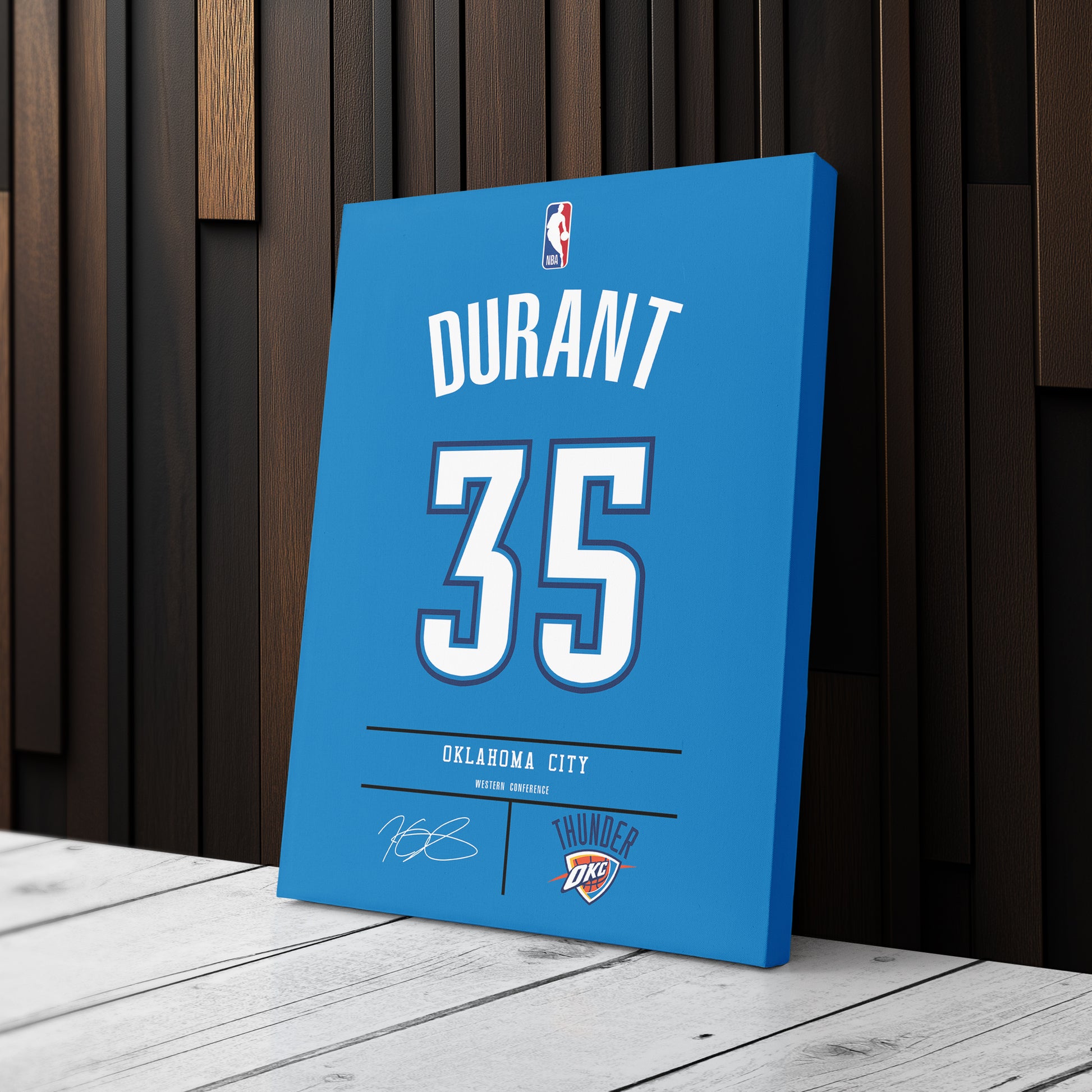 Featuring Kevin Durant’s iconic Oklahoma City Thunder jersey number and team logo, this premium canvas is available in various sizes and can be framed or unframed to suit your decor needs. It’s the ideal gift for sports enthusiasts and basketball lovers alike, offering high-quality materials and a lasting impression.