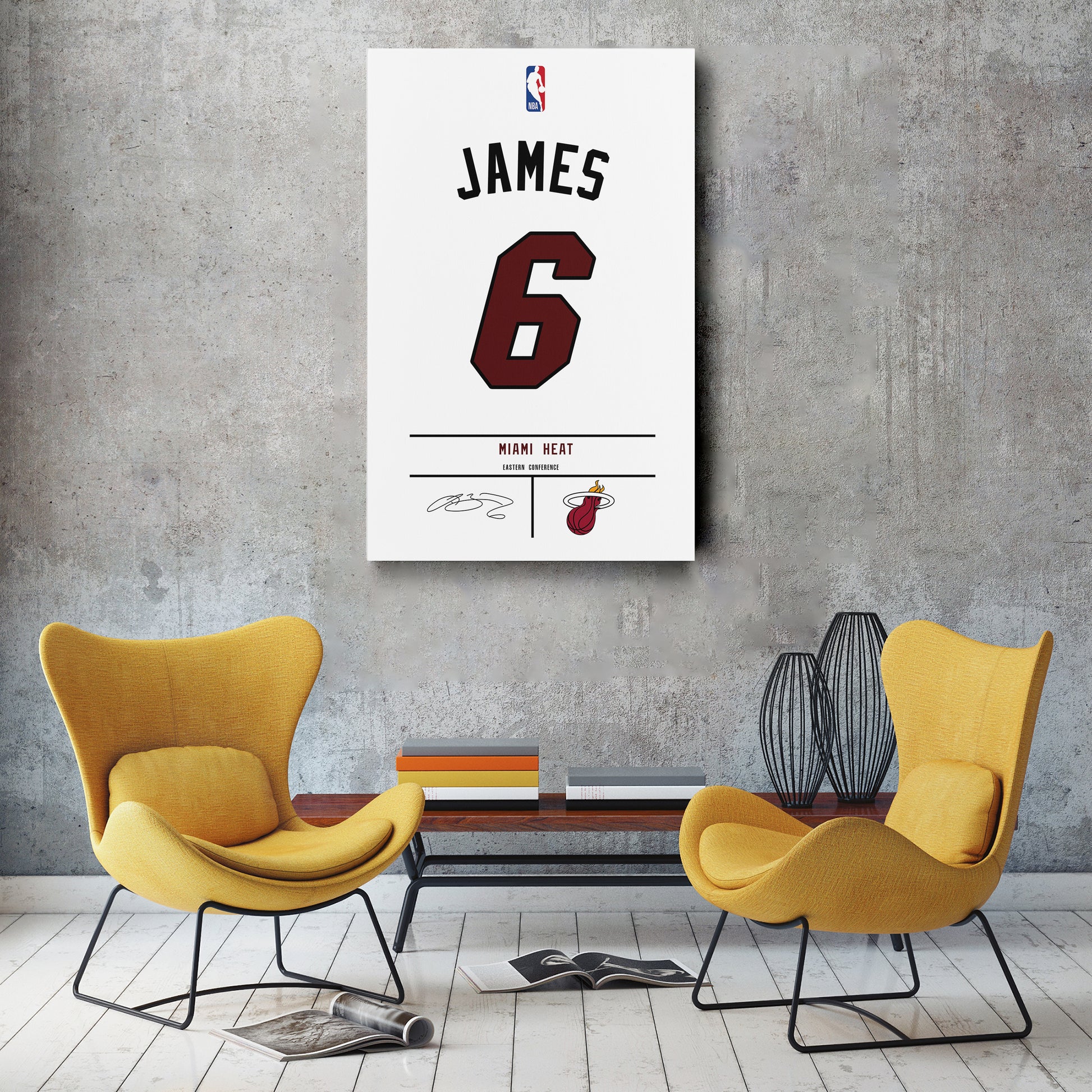 Elevate your space with this LeBron James Jersey Canvas Print, designed to bring the energy of Miami Heat basketball into your home. Perfect for die-hard Heat fans, this vibrant wall art captures the essence of LeBron James' legendary career. Whether you’re enhancing your fan cave, office, or living room, this made-to-order canvas print adds a bold and stylish touch to any setting.