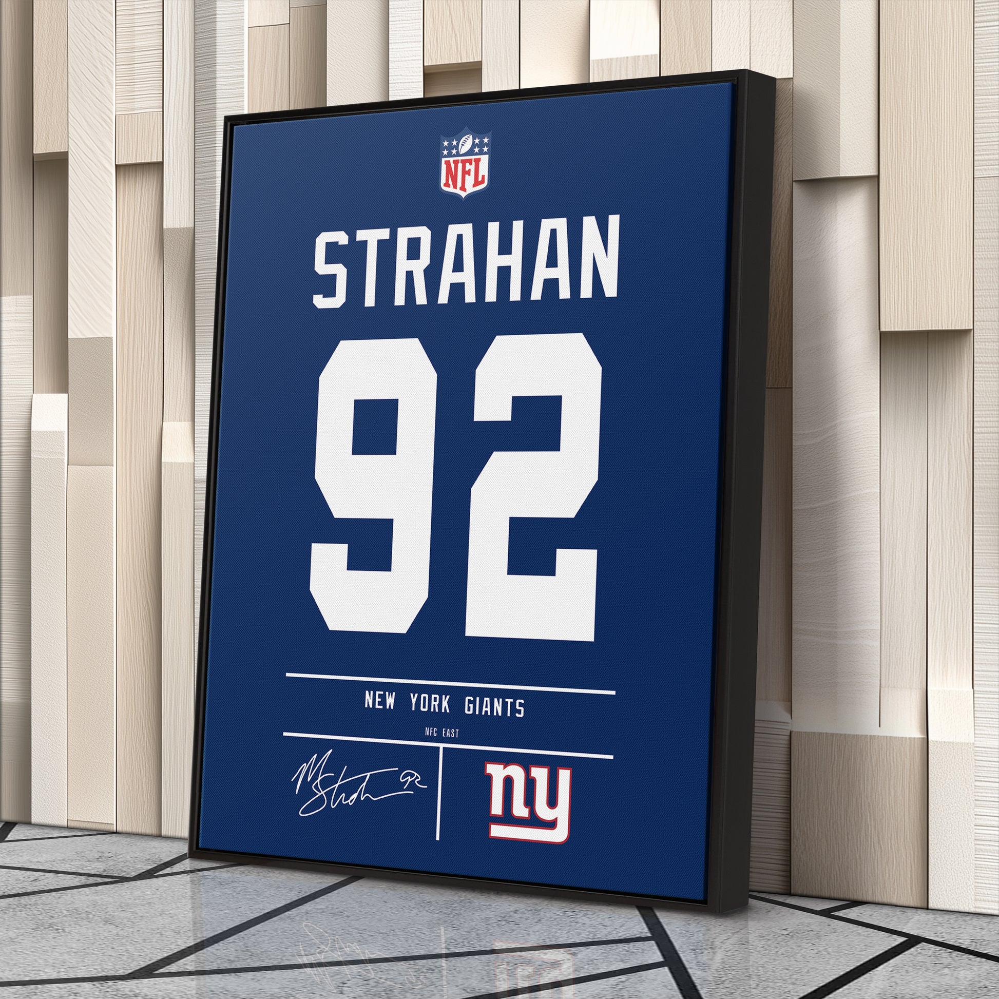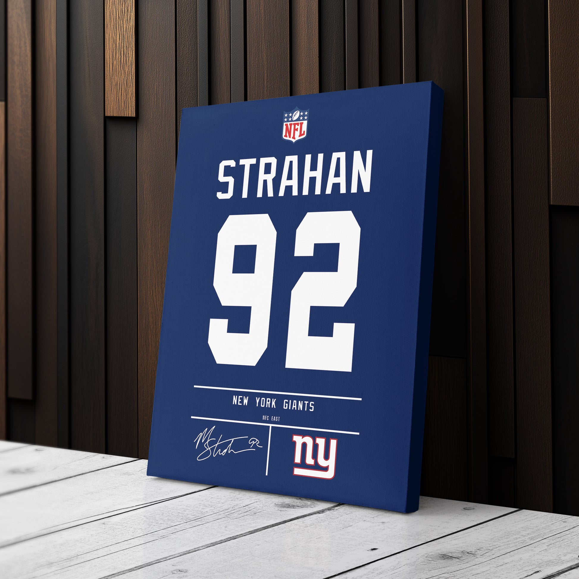 Featuring Michael Strahan’s iconic New York Giants jersey number and team logo, this premium canvas is available in various sizes and can be framed or unframed to suit your decor needs. It’s the ideal gift for sports enthusiasts and football lovers alike, offering high-quality materials and a lasting impression.