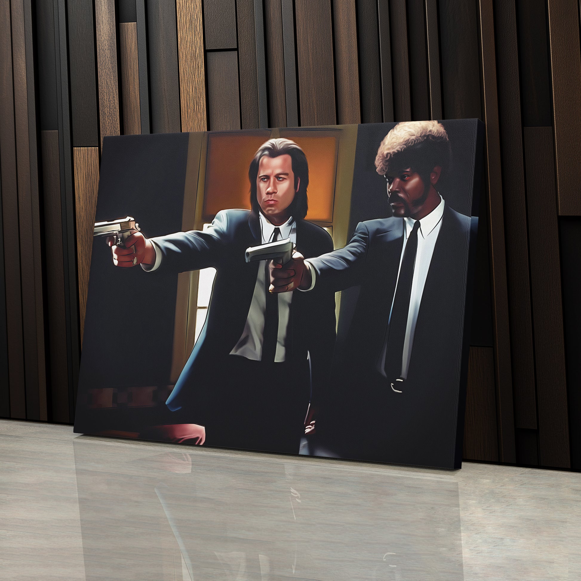 Bring the bold, action-packed energy of Pulp Fiction to your space with this Gun Point Canvas Print, inspired by one of the film’s most iconic moments. Featuring Vincent Vega and Jules Winnfield in their legendary standoff, this artwork is a must-have for any Tarantino fan, movie enthusiast, or collector of cult classics. Whether you're decorating your home theater, game room, office, or fan cave, this high-quality canvas print captures the cinematic intensity and unforgettable style of this legendary film.