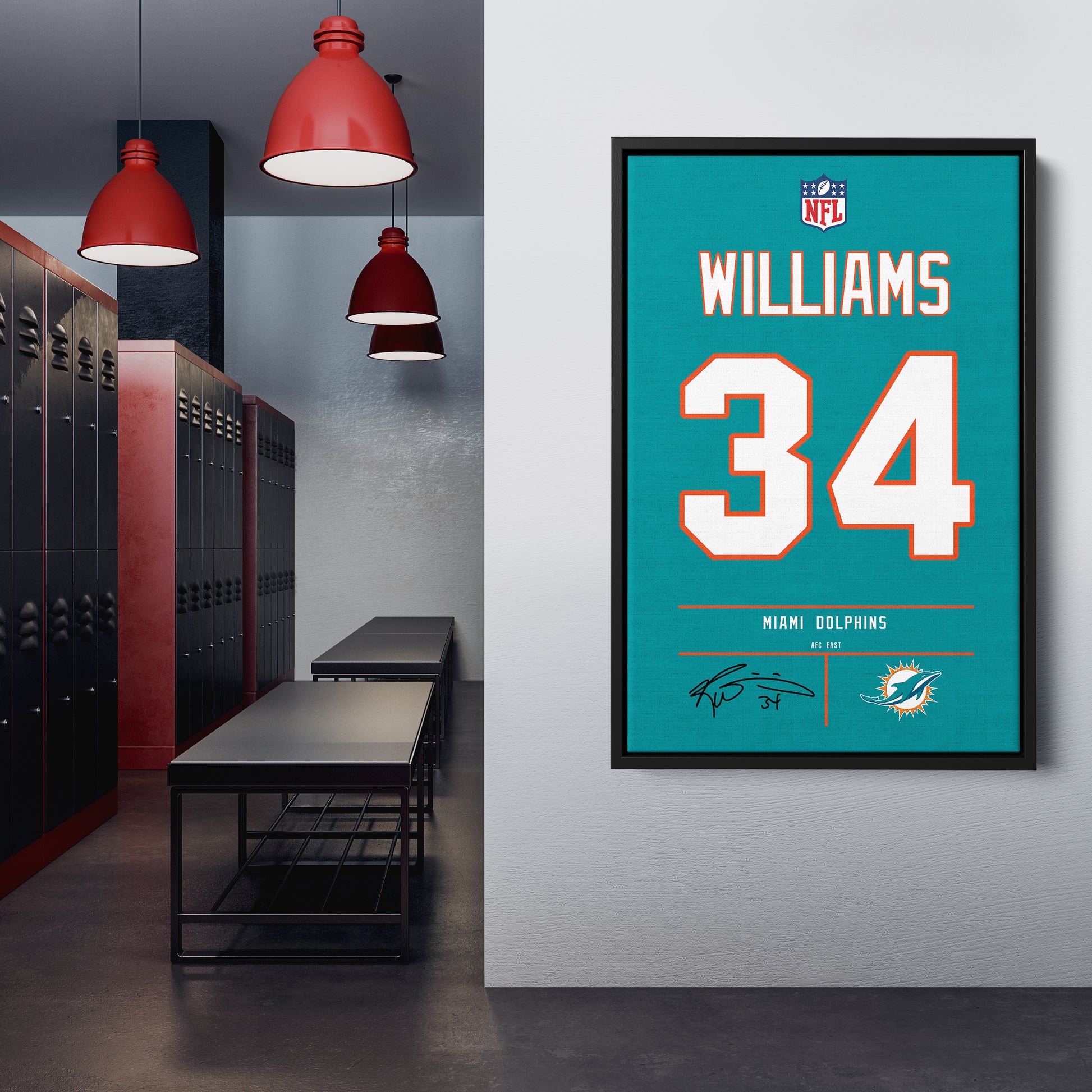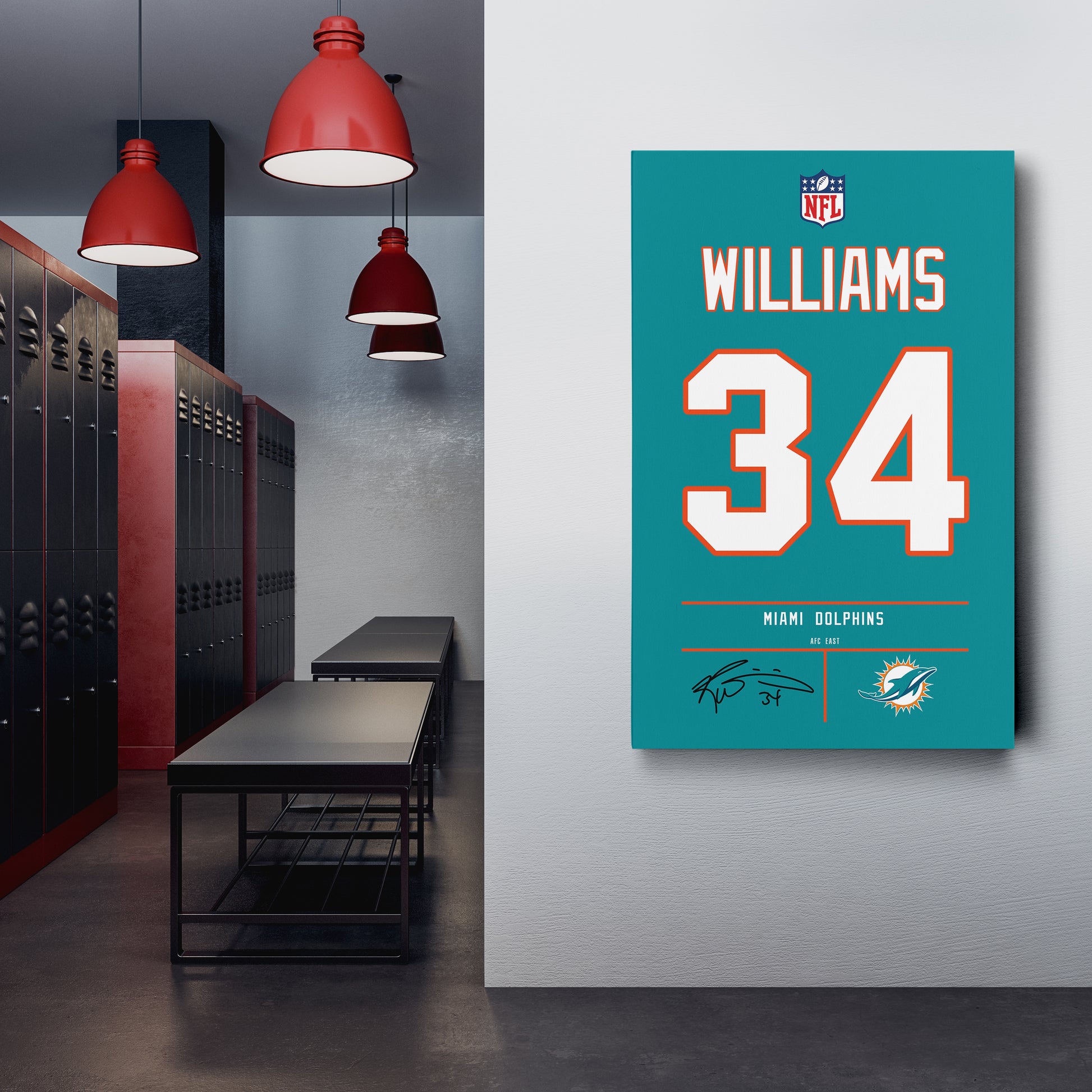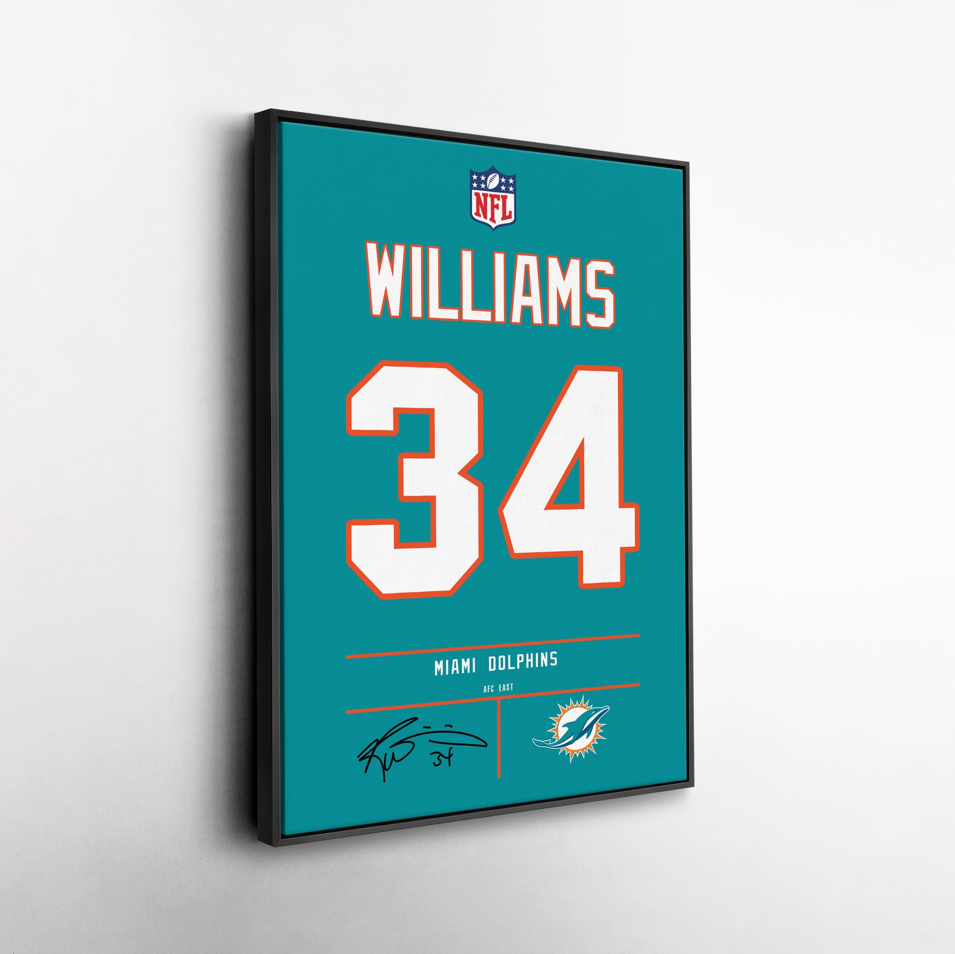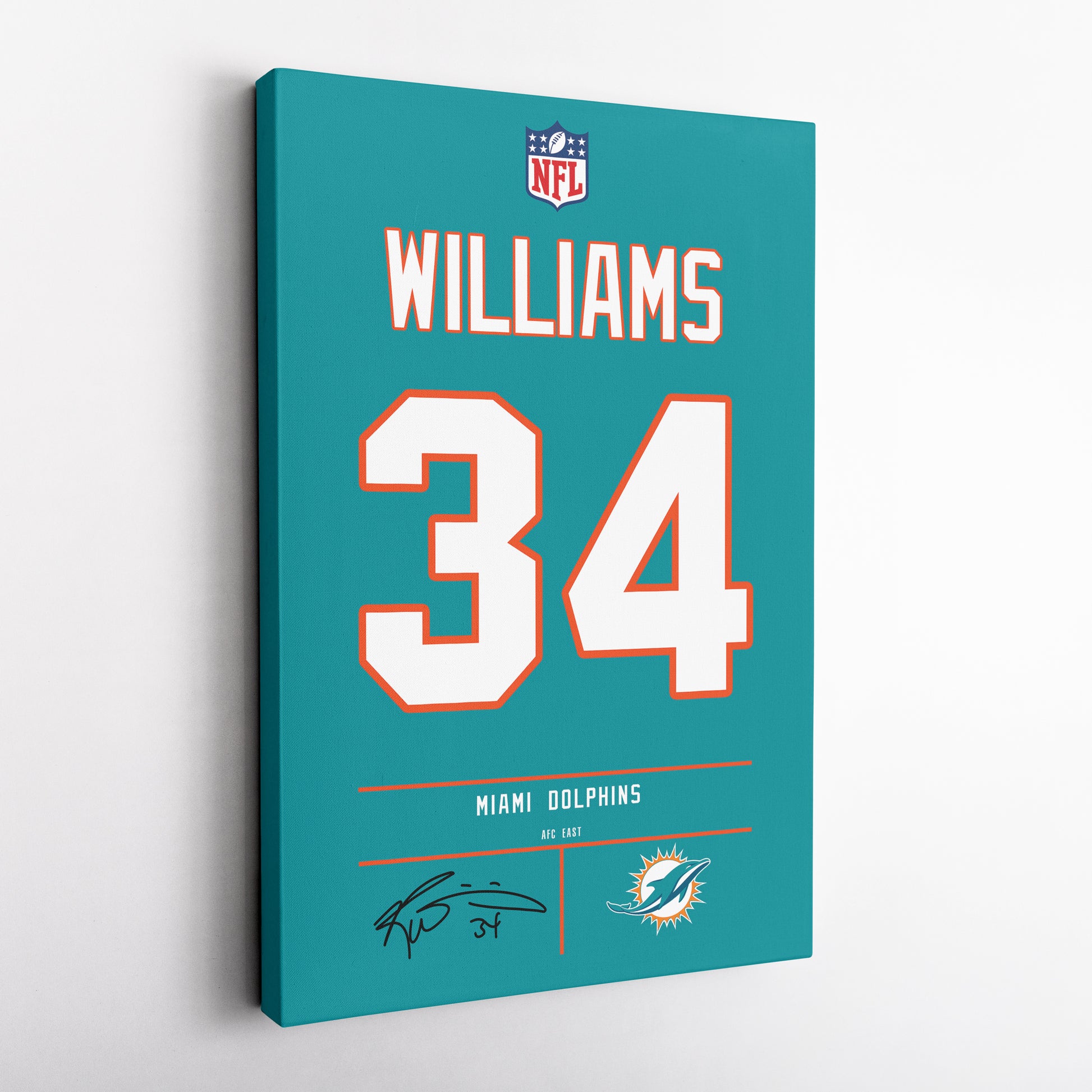 Featuring Ricky Williams’ iconic Miami Dolphins jersey number and team logo, this premium canvas is available in various sizes and can be framed or unframed to suit your decor needs. It’s the ideal gift for sports enthusiasts and football lovers alike, offering high-quality materials and a lasting impression.