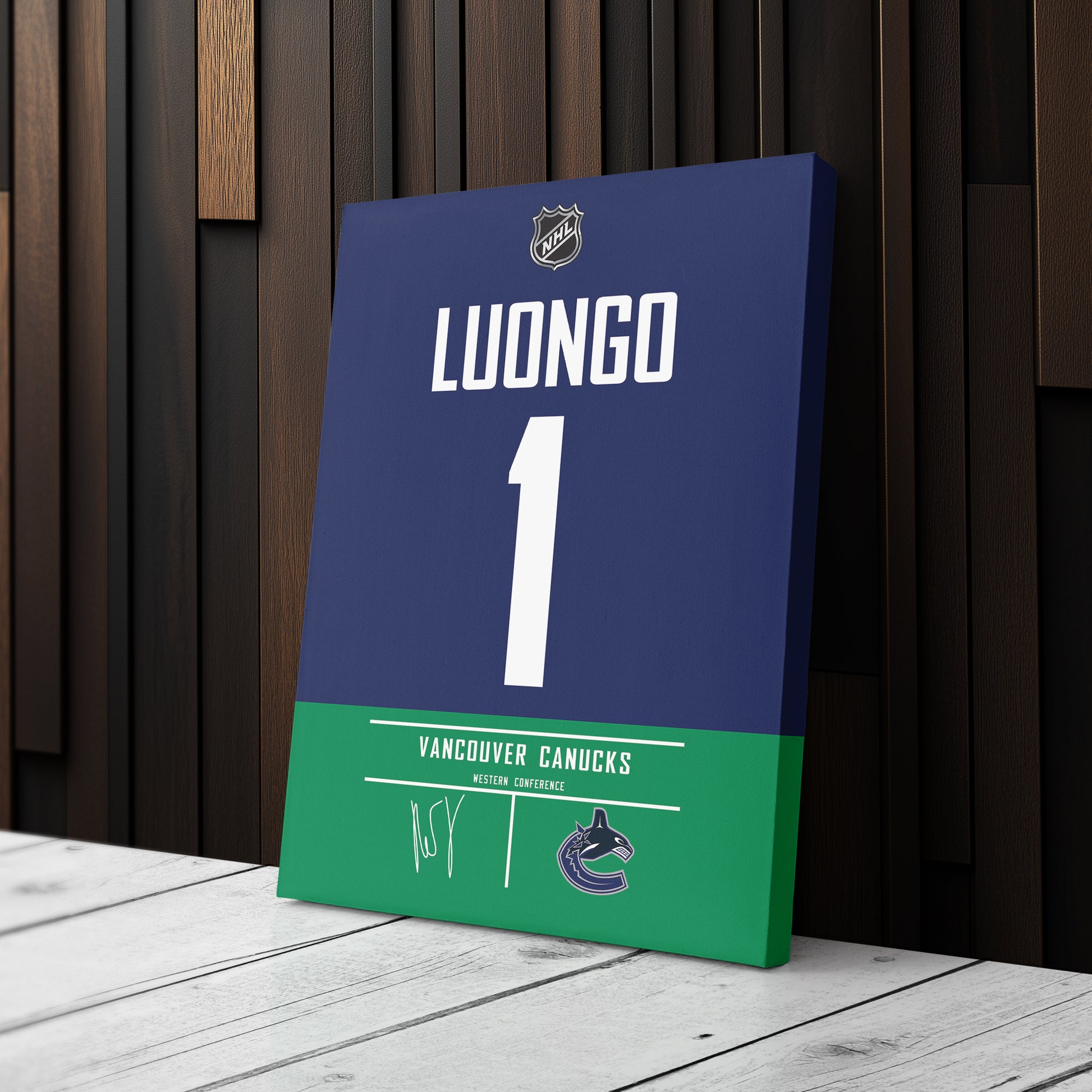 Featuring Roberto Luongo’s iconic Vancouver Canucks jersey number and team logo, this premium canvas is available in various sizes and can be framed or unframed to suit your decor needs. It’s the ideal gift for sports enthusiasts and hockey lovers alike, offering high-quality materials and a lasting impression.