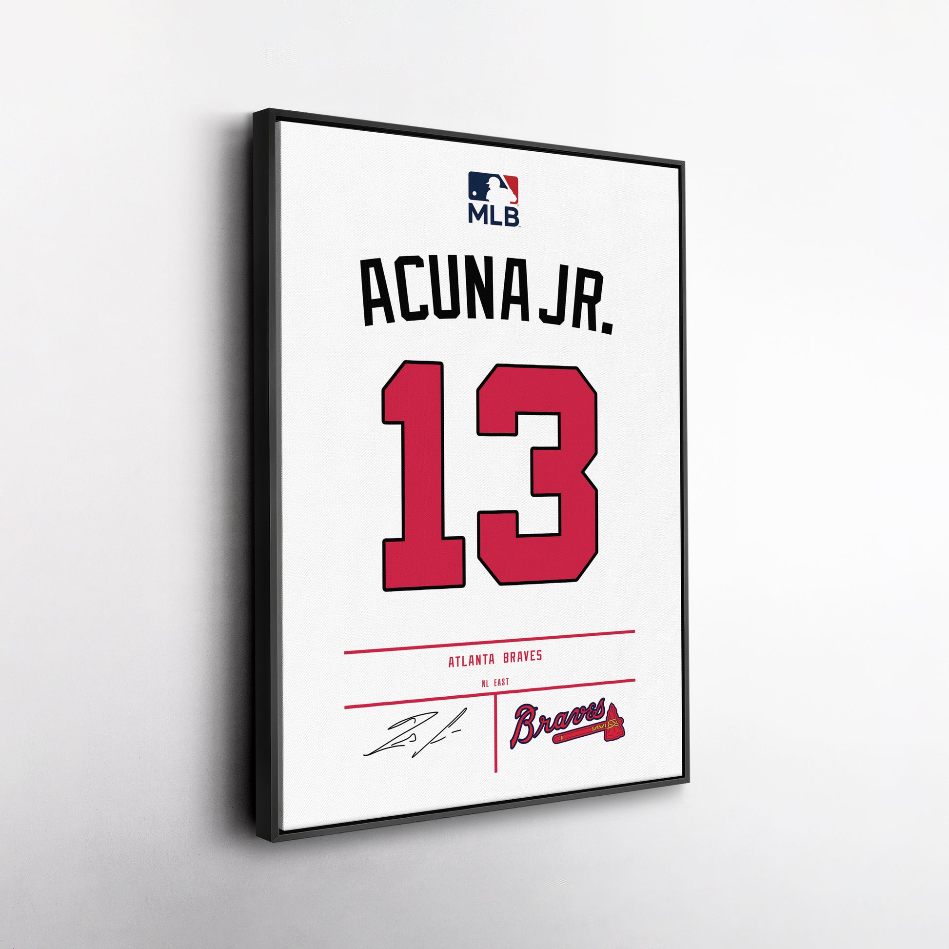 Featuring Ronald Acuña Jr.’s iconic Braves jersey number and team logo, this premium canvas is available in various sizes and can be framed or unframed to suit your decor needs. It’s the ideal gift for sports enthusiasts and baseball lovers alike, offering high-quality materials and a lasting impression.