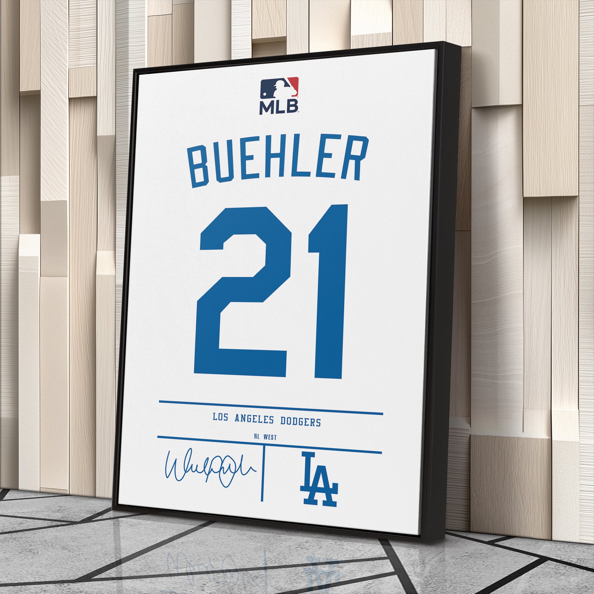 Featuring Walker Buehler’s iconic Dodgers jersey number and team logo, this premium canvas is available in various sizes and can be framed or unframed to suit your decor needs. It’s the ideal gift for sports enthusiasts and baseball lovers alike, offering high-quality materials and a lasting impression.